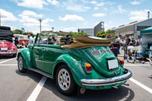 埼玉県から1972年式VW「タイプ1 1302Sカブリオレ」に乗ってご夫婦でイベントにエントリーした青木卓哉さん(36歳)は、免許を取ってからずっとビートル一筋。ちなみに戦前の1938年に登場したVWタイプ1のフロントサスペンションはトーションバー式だったが、フロントにストラット式サスペンションを採用した「1302」(通称マルニ)が1971年式から追加され、さらにエンジンを1300ccから1600ccに増強したのが「1302S」となる。よく見るとフロントのボンネットがトーションバーのビートルよりも盛り上がっているのが1302の特徴だ。