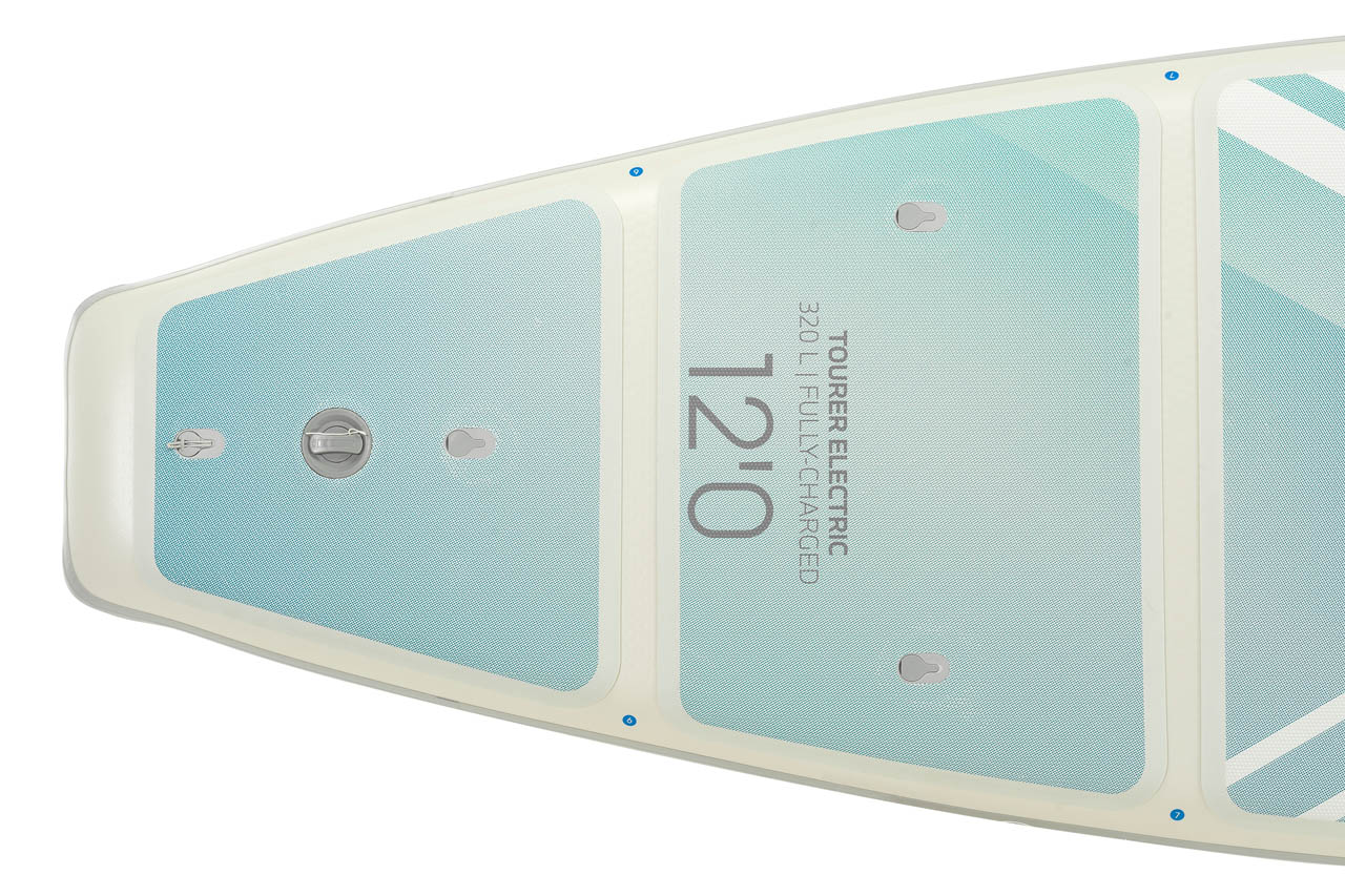 ボード本体の設計にも妥協はない。特別に開発された「X-wovenドロップステッチコア」構造を採用することで、卓越した構造的剛性と安定性を確保している。ボードのサイズは長さ3.65m、幅0.82m、厚さ0.15mで、最大2人まで搭乗可能だ。重量はボード単体で10.9kg、モーターを含めても14.9kgと、軽量性と堅牢性を両立させている。