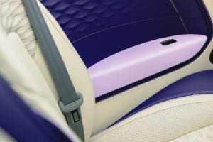 エクステリアの「ヴィオレット」を反映したタンザナイト・パープルの特注レザーが、センターコンソールや立体的なドアパネル、シートバックなどに採用されている。それを際立たせるため、シート本体やステアリングホイールの一部にはリネンカラーのレザーが組み合わされた。