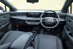インテリアは、EV専用のCMF-EVプラットフォームの採用により、フラットで開放感のある足元空間と使い勝手の良いラゲッジルームを実現した。インストルメントパネルは水平基調のフローティングデザインでミニマルな雰囲気を演出し、日産初となる調光パノラミックガラスルーフ(遮熱機能付)が設定された。このガラスルーフは、シェード機構を不要にすることで、流麗なルーフラインと後席の頭上空間を両立させるという、デザインと機能の課題を解決する革新的な装備である。