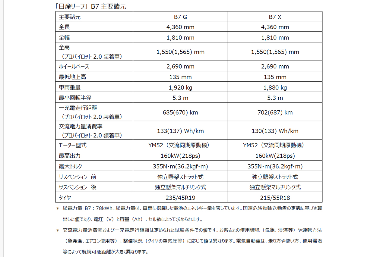 最大の注目点である航続距離は、78kWhのバッテリーを搭載した「リーフ B7」において、一充電で最大702km(WLTCモード)を達成した。これは、プロパイロット2.0非搭載の「B7 X」グレードの数値である。この卓越した航続距離は、単に大容量バッテリーを搭載するだけでなく、車両全体の効率を極限まで高めるという日産の「効率至上主義」という開発思想に支えられている。エクステリアデザインは、空力性能を徹底的に追求した「スーパーエアロ」というアプローチが貫かれており、ファストバックスタイルのシルエットや電動格納式のアウトサイドドアハンドル、フラットな床下構造などによって、クラストップレベルの空気抵抗係数(Cd値)0.26を実現した。