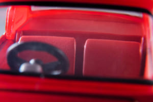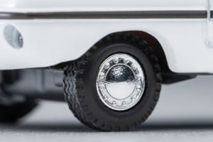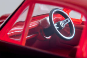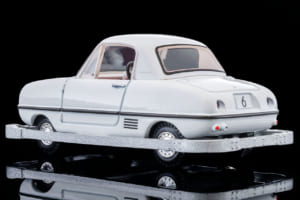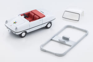 写真で分かる通り、その可愛らしいフォルムが見事に再現されているのは言うまでもないが、実車の小ささ(全長2960mm/全幅1420mm いずれもバンパーガード含む数値)が正確に1/64にスケールダウンされており、手のひらに乗せて、あるいは同スケールの他のミニカーと並べて、そのサイズ感をひしひしと感じることができるのも嬉しいところだ。車両本体のルーフと、車両を保護するバンパーガードはいずれも取り外し可能となっており、またバンパーガードはダイキャスト製となる。