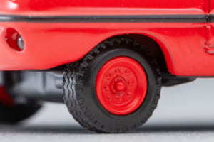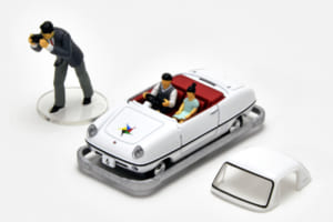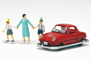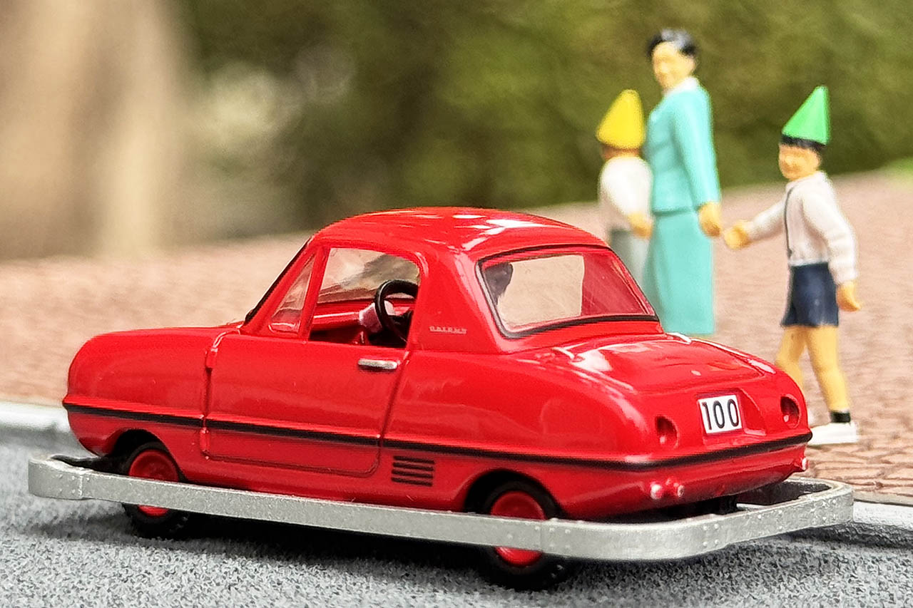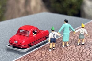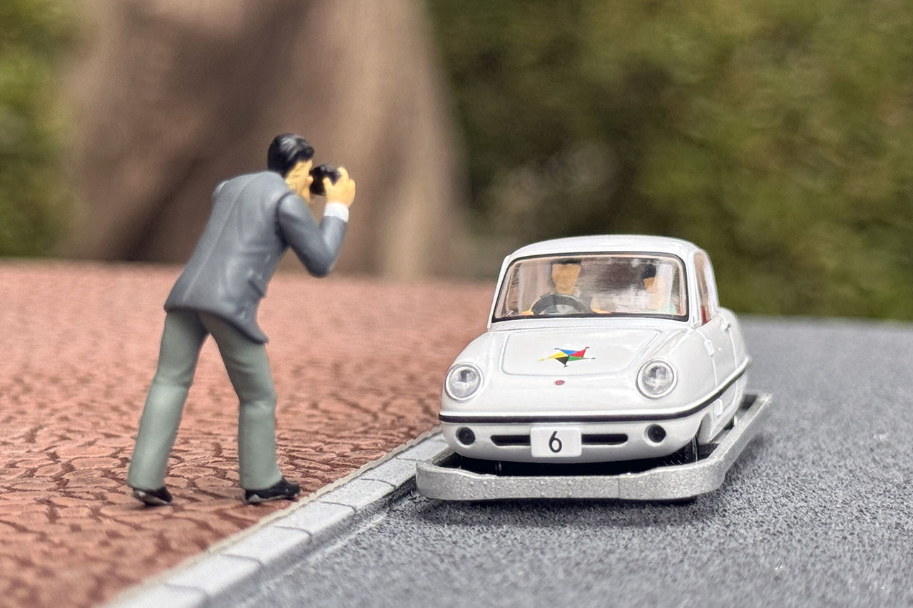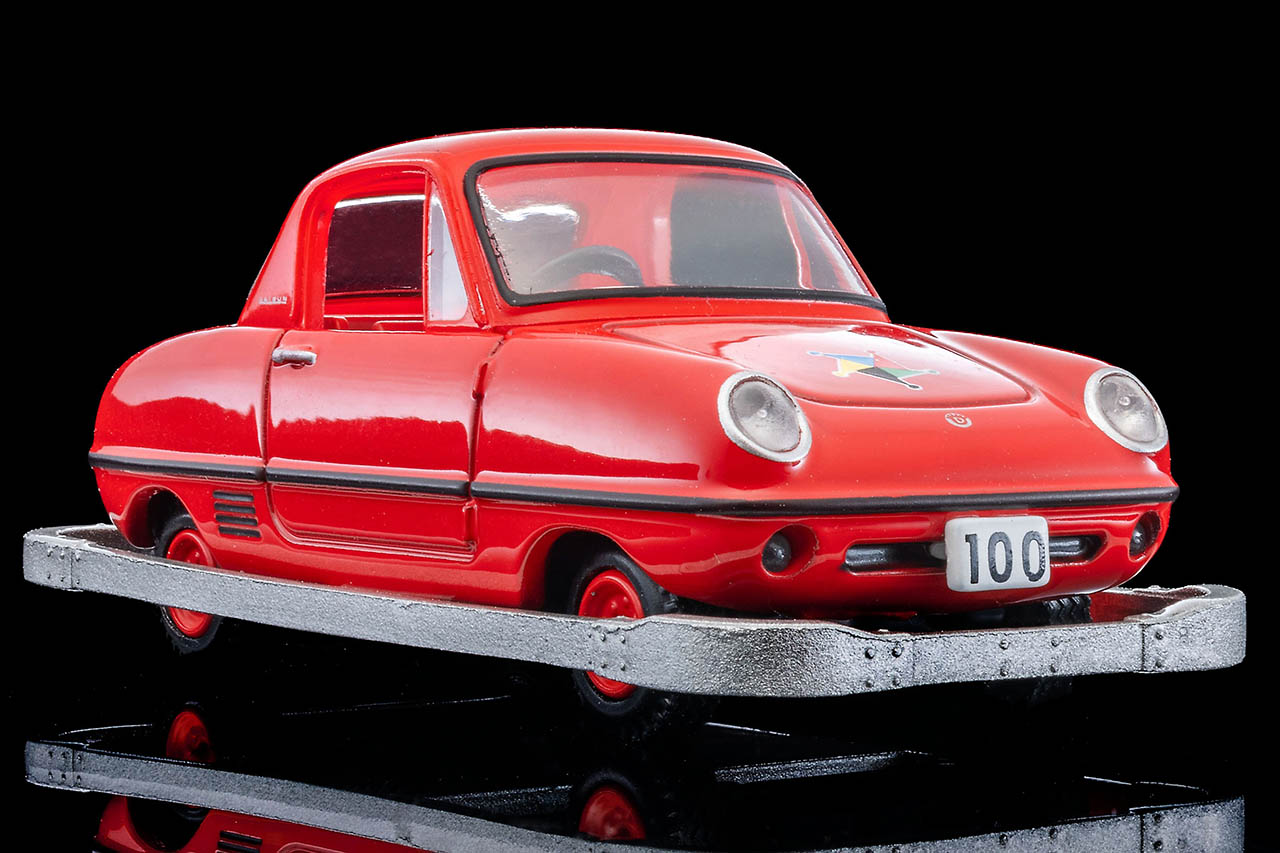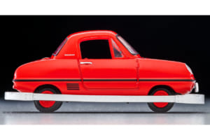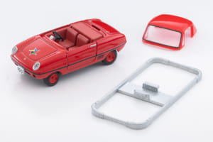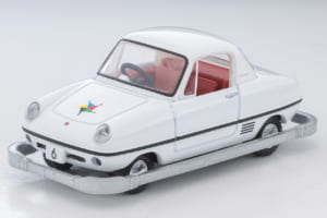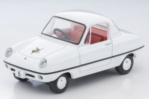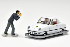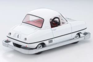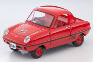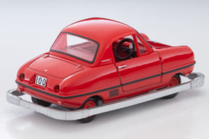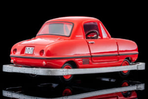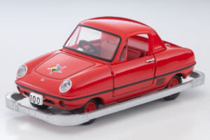 実車のボディカラーは3色が存在したが、ミニカーは白と赤の2色で発売。白は6号車でホイールキャップ装着状態であり、新車当時を再現したものだ。さらに、乗車状態の子供2名と、その姿を写真に収めようとカメラを構える大人1名のフィギュアが付属する。赤は件のレストア車両である100号車をモチーフとし、ホイールキャップなしの復活後の姿のモデル化で、手を引かれる子供2名と手を引く大人1名のフィギュアが付属する。どちらも予価7,480円(税込)、2026年4月発売予定。