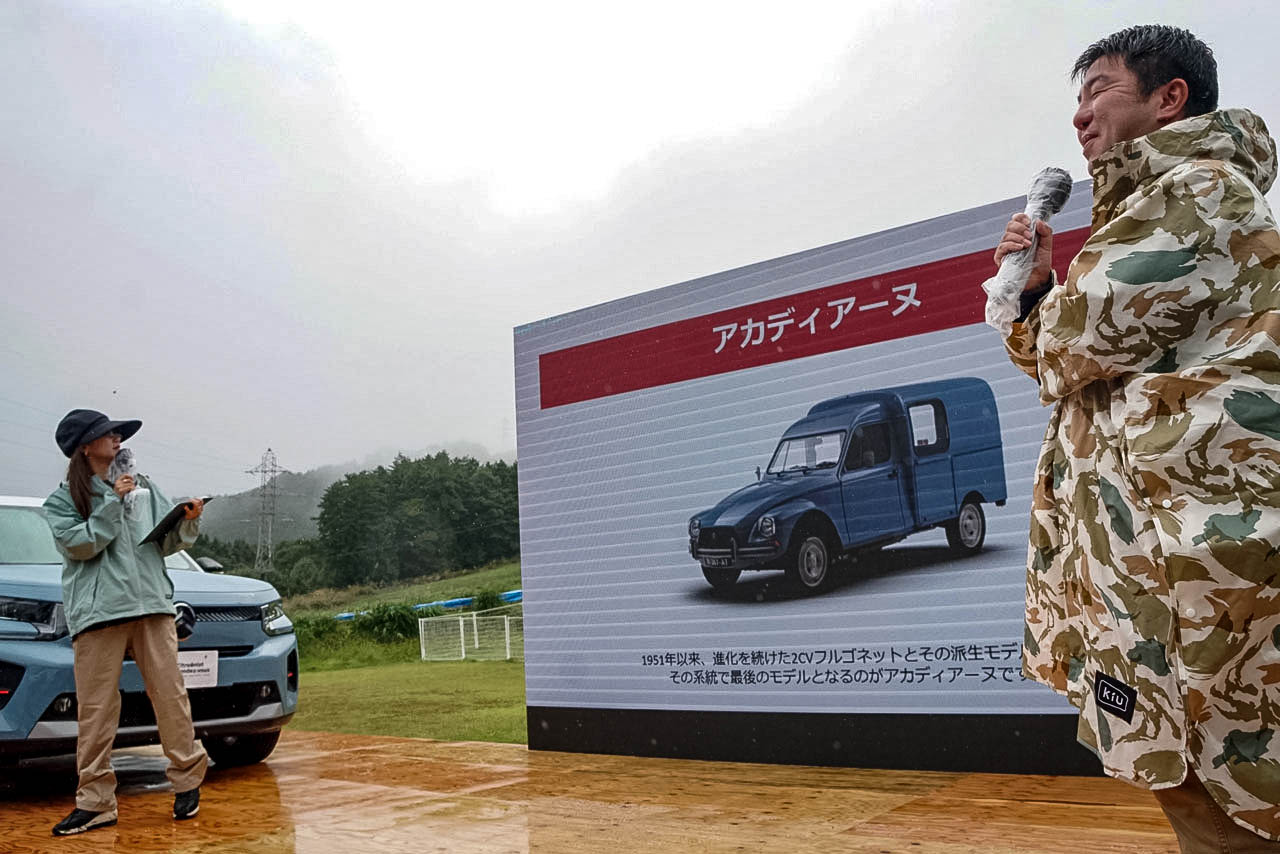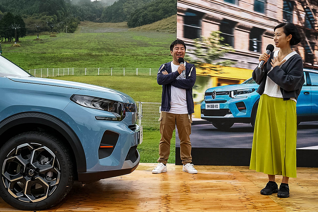 イベントは基本的にメインステージで進行。オープニングのあと9時45分過ぎからスペシャルコンテンツと題したプログラムが始まった。ステージに上がったステランティスジャパン フレンチブランド事業統括の小川隼平氏は、イベント当日付けで発表されたばかりの新型「C3」が会場に来ていて、しかもステージに上がってくると言う。そしてステランティス・ジャパン コミュニケーションマネージャー中山領氏の案内のもと、雨の中でも映える水色の新型C3がスロープから“登壇”すると、発表ホヤホヤのニューモデル公開に会場は大きくどよめいた。
