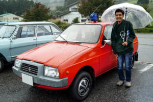 まずは、日本に数台レベルの超希少モデルである1979年式の「ヴィザ・クラブ」で京都からやってきた三浦夏樹さんだ。ヴィザは、シトロエンとプジョーが1970年代に合併した際、「プジョー104」のプラットフォームにいかにもシトロエンらしい摩訶不思議なデザインなボディと2CV系のフラットツインを載せたモデルだ。