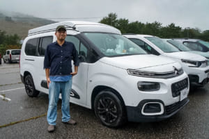 「キャンパー仕様のまさに第1号車です。リアがフルフラットになるのと車内高さが重要だったのですが、ベルランゴロング以外で条件を満たすものがありませんでした。乗り心地が良く遠出が楽ですね。ディーゼルで燃費が良いのも気に入っています」