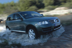 初代モデルは、電子機械式ロールスタビライゼーションや6段階のレベル設定が可能なCDCエアサスペンションといった多くの革新技術を搭載し、2002年秋の市場導入直後から高い評価を得た。水深58cmまでの走行や最大45度の傾斜を登ることも可能であった。特に象徴的だったのは「トゥアレグ V10 TDI」で、当時のVW最強のディーゼルエンジンであった5リッター10気筒エンジンを搭載。230kW(313ps)のパワーと750Nmの最大トルクを発生し、2.5トンの車体を0-100km/hで7.8秒で加速させた。初代は2009年までに47万1000台以上が販売される成功を収めた。