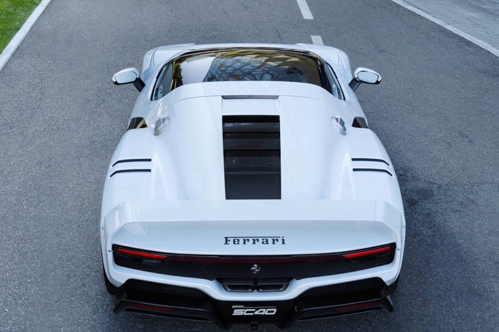 プロポーションは、長く低いノーズと短いリアオーバーハングでバランスを取る。特徴的なのは、専用色「SC40ホワイト」で塗装された固定式のハイリアウイングだ。ウイングはボディ側面から流れ、エンジンカバーから垂直に立ち上がりシームレスに一体化する。黒いセパレーションラインがその一体感を際立たせ、ブラック仕上げのリアフェイシアを強調。リアはオープンメッシュで構成され、メカニカルなコンポーネントが覗く。V6エンジンはスモーク仕上げのLexan製ルーバーを通してアピールされ、下部エアインテークへと視覚的につながる。ホイールアーチ付近のリアフェンダーにも小型ルーバーが配される。リアセクションは、アディティブ・マニュファクチャリング製のセンターエキゾーストで完成される。チップはチタンとカーボンファイバー製である。テールランプはベースの296 GTBを明確に想起させる。