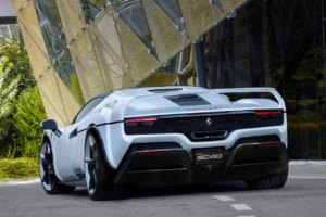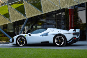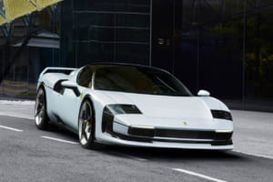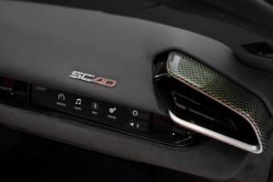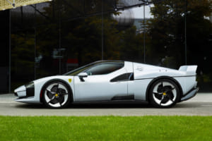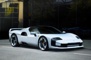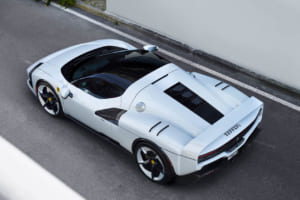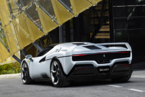 外装色の「SC40ホワイト」は専用開発色である。このクールな色調は、太陽光の下でボディの曲線を際立たせ、インテリアのカーボン・ケブラーを想起させる。SC40ロゴは車体右側にのみ配置。燃料キャップと充電キャップはブラッシュ仕上げのアルミニウム製だ。リアエンジンカバーの「Ferrari」の文字はネガティブ(逆彫り)で、下のカーボン地が透けて見える。ホイールも専用デザインで、ダイヤモンドカット面のブラッシュドメタルと、幾何学的なブラックスポークが組み合わされている。