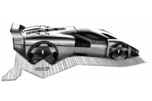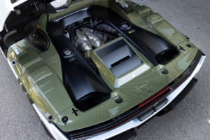 サイドビューはインタークーラー用エアインテークが支配的だ。これはNACAダクトを再解釈したもので、大型の三角形カーボンファイバー製プレートがそれを強調する。デザインのリズムは、フロントフェンダー、ドアカット、エンジンカバーのシャープなエッジを縁取る垂直線によって定義される。この垂直線は、クルマの視覚的緊張感を譜面のように構築するグリッドを形成している。フロントは、外側コーナーのヘッドライトが特徴だ。ブラックハウジングに統合されたヘッドライトは、下方へ伸びてロワーエアインテークと接続。インテークはバンパー全体に広がり、精悍な外観を与える。長方形のフレームで縁取られたブレーキエアインテークと、その上のデイタイムランニングライトが印象を強めている。