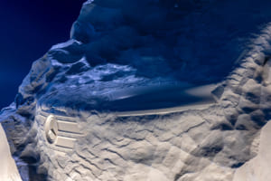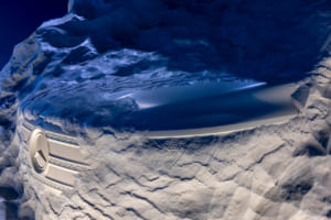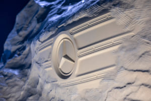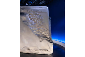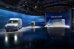 公開された彫刻「THE BOULDER」は、石のような外観を持ち、全長6.5m×全高2.75m×全幅2.5mという印象的なサイズである。固い素材から削り出されたもので、アートとクラフトマンシップを融合させ、次世代スプリンターのプレビューを提供する。この彫刻は、商用顧客の多様なニーズに向けたユニークなエクステリアデザインの最初の輪郭を示すと同時に、将来のバンの寸法についての印象も与えるものだ。
