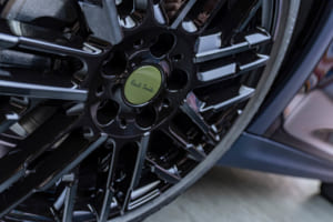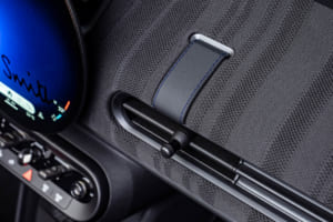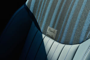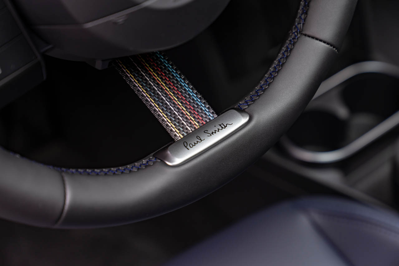 英国的な自制心とエレガンスはインテリアにも反映されている。ダッシュボードとドア・パネルにはブラックのニット素材が採用され、ダッシュボードにはストライプ・パターンのポール・スミス・ファブリックがアクセントとして配される。ナイトシェード・ブルーのスポーツ・シートや、ステアリング・ホイールのテキスタイル・ストラップにあしらわれたシグネチャー・ストライプモチーフの飾り縫いも、一目でポール・スミスと分かるデザインだ。