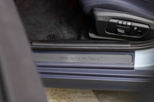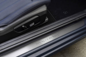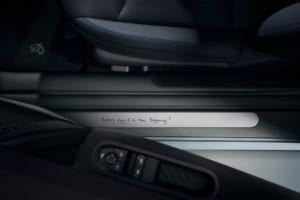 コックピット中心の円形センターディスプレイでは、パーソナル・モードで3種類のポール・スミス・バックグラウンドを選択可能。そして、ポール・スミス氏が語ったように、ドアを開けると地面に手書き風の「hello」の文字が映し出され、ドア・シルには「Every day is a new beginning」のモットーが刻印、フロアマットにはウサギをモチーフにしたデザインのリベットが施されるなど、乗るたびにポジティブな気分にさせてくれる仕掛けが満載である。