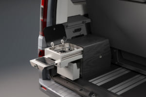 ラゲッジスペースに搭載されるこのキッチンモジュールには、組み込み式のガスコンロ、スプレーアタッチメント付き折りたたみ式シンク、5Lの浄水タンク、そして収納スペースが含まれており、車両を快適な居住空間へと変化させる。この仕様により、本車両はSPV(特殊用途自動車)分類に基づくキャンピングカーとしての承認を受けている。