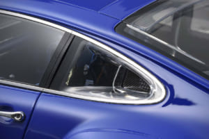さて試作品の撮影から約半年を経てようやく入荷してきたメイクアップ社「アイドロン」1/18スケール・モデルカー本製品のシンガーDLSに話を戻そう。試作品と比較して、モデルの基本設計や部品構成、仕上げ工程に変更はなく、塗装はプロフェッショナル・ペインターの当モデルに対する習熟度が上がったゆえであろうが、より深く艶やかな仕上がりを見せている。