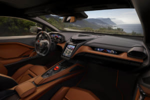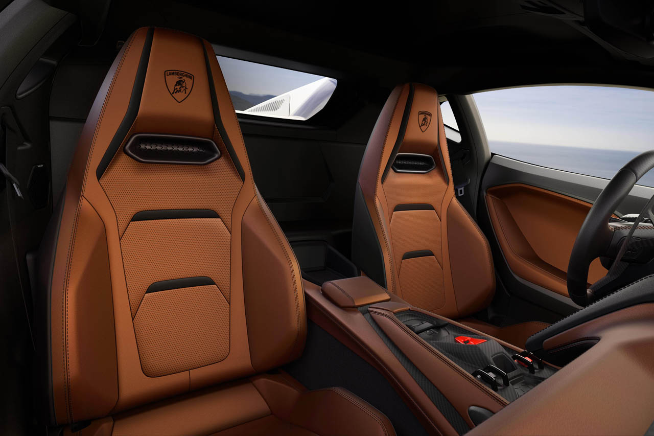 メーターや計器類などを含むコクピット周りの風景には、ランボルギーニの流儀が貫かれた只者ならぬ雰囲気が漂っている。いっぽうで、スペースフレーム構造の新しいアーキテクチュアのおかげで、天地方向や足元のスペースが拡大されていて、身長2mのドライバーがヘルメットを装着して着座しても天井に触れないそうだ。さらに、前席の後ろにはちょっとした荷物が置けるスペースまで確保されている。日常の使い勝手も考慮されているのだ。
