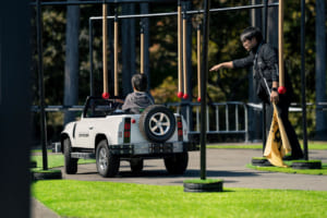 イベントの核となるのは、やはりディフェンダーの真骨頂である走行性能を確かめる試乗プログラムである。会場には、日常では決して味わうことのできないスリル満点のアトラクションが用意された。その筆頭が「ツインテラポッド」だ。高さ5m、最大傾斜角43度にも達するこの専用スロープは、インストラクターの運転による同乗体験として提供された。空に向かって急勾配を登り、また急降下するという挙動は、ジェットコースターさながらの迫力でありながら、車両の圧倒的な登坂能力と安定性を証明するものであった。
