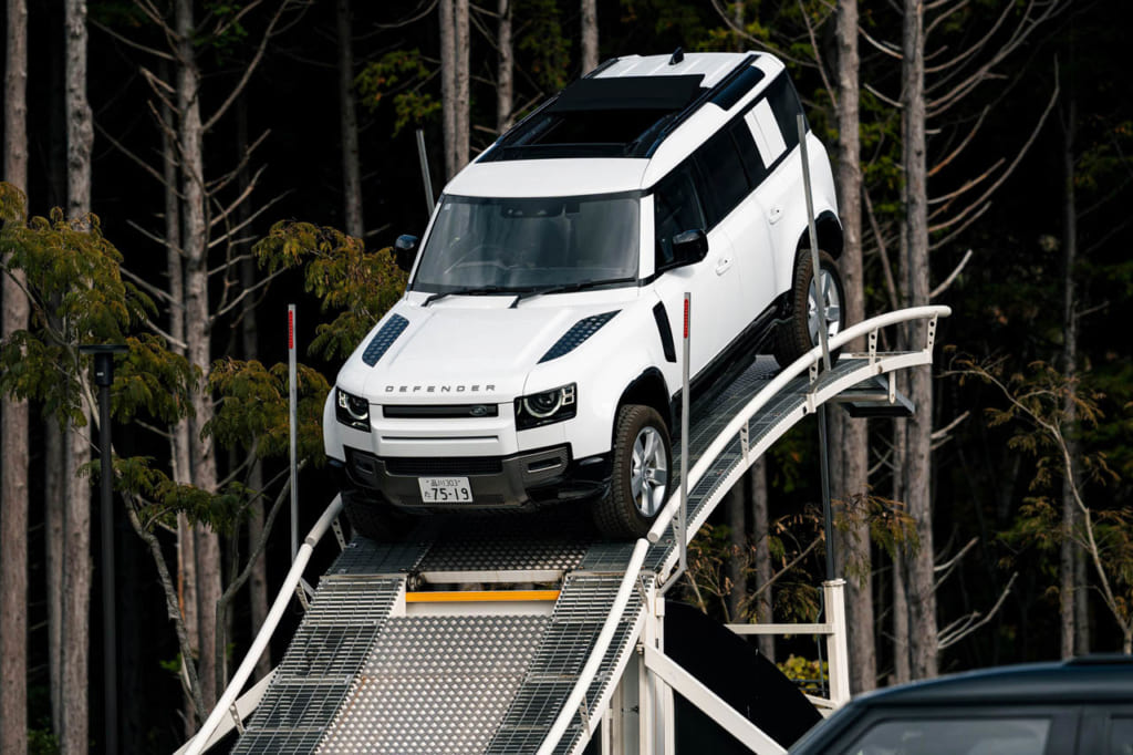 また、参加者自身がステアリングを握るプログラムも充実していた。「ミニテラポッド+バンク」では、凹凸のある路面や斜面を自身の運転でクリアしていくことで、悪路走行における車両のコントロール性を体験できた。さらに、会場内に設けられた特設オフロードコースでの走行や、実際の自然環境の中を走る「林道試乗」、そして周辺の公道を走る「一般道試乗」と、あらゆるシチュエーションでディフェンダーの懐の深さが披露されたのである。