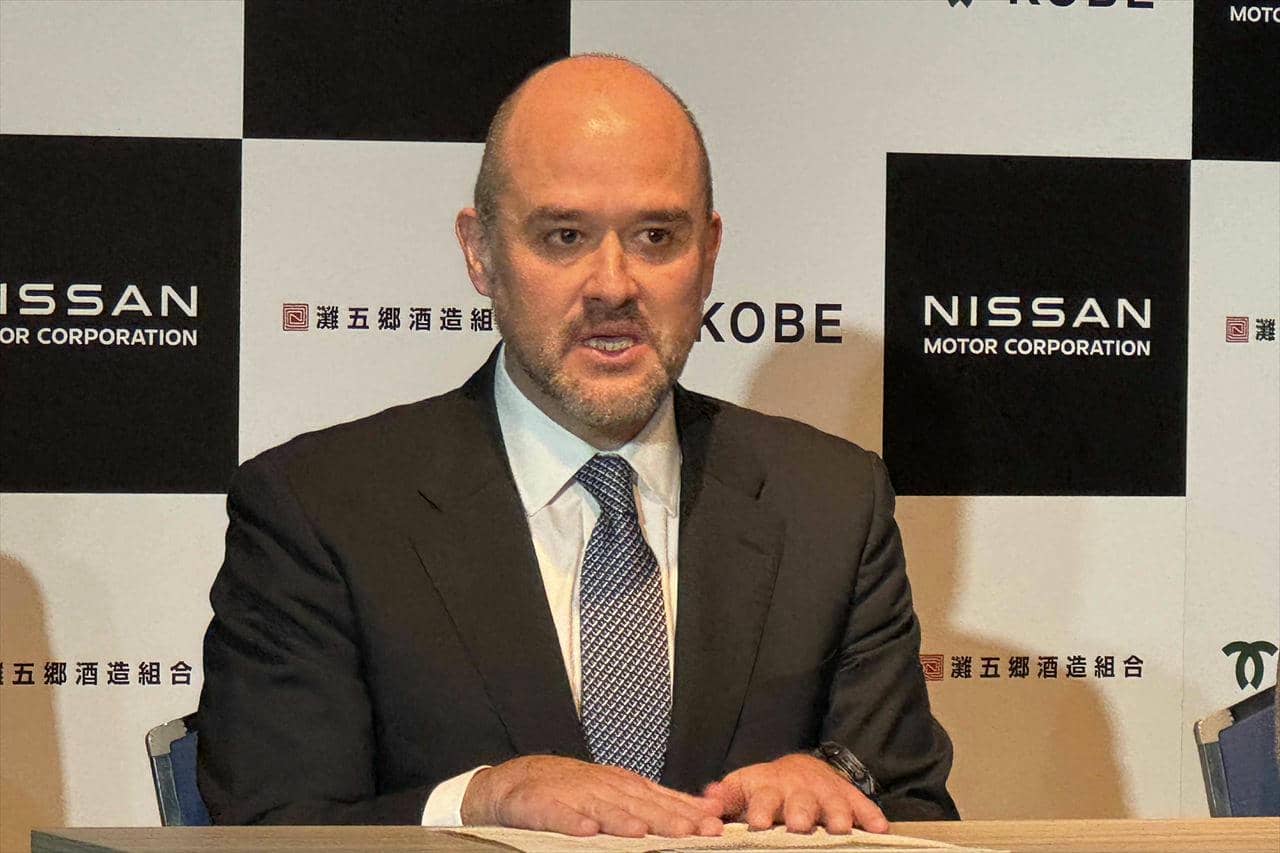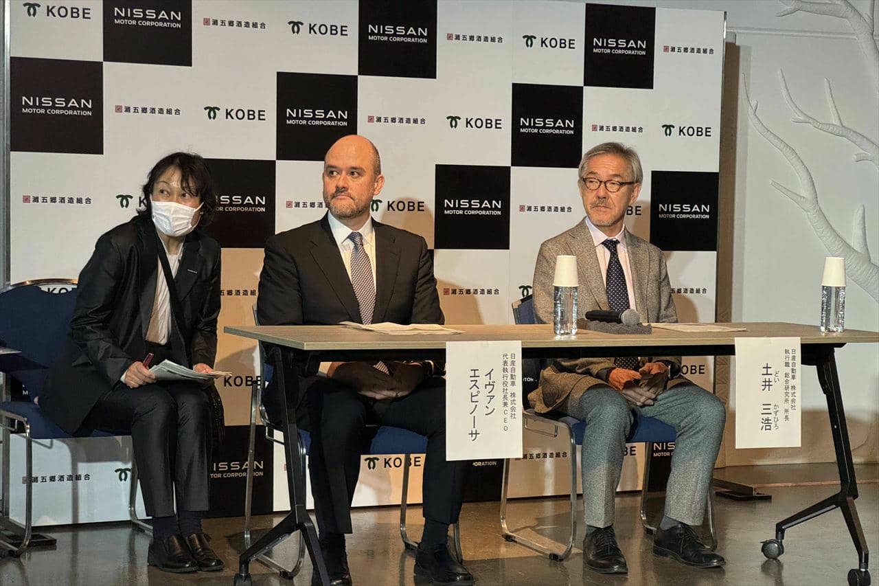 神戸市の白鶴酒造資料館で行われた合同記者会見では、神戸市長の久元喜造氏と、日産自動車代表執行役社長兼CEOのイヴァン・エスピノーサ氏、同執行職 総合研究所所長の土井三浩氏、そして灘五郷酒造組合理事長で白鶴酒造代表取締役社長の嘉納健二氏が登壇。