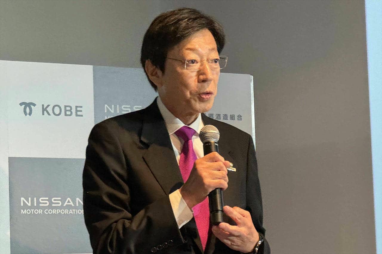 神戸市の白鶴酒造資料館で行われた合同記者会見では、神戸市長の久元喜造氏と、日産自動車代表執行役社長兼CEOのイヴァン・エスピノーサ氏、同執行職 総合研究所所長の土井三浩氏、そして灘五郷酒造組合理事長で白鶴酒造代表取締役社長の嘉納健二氏が登壇。