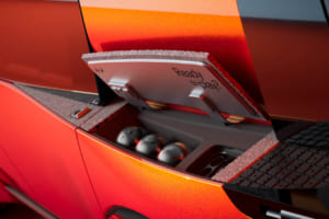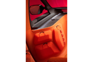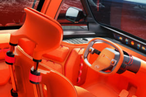 一方、グッドイヤーとは、地形や天候を選ばないスマートタイヤ「Eagle Xplore」を開発した。このタイヤには空気圧や摩耗をリアルタイムで監視するセンサーが内蔵されており、ホイールに埋め込まれたLEDライトが空気圧の適正状態(緑)や不足(赤)を即座に知らせる機能を持つ。タイヤのサイドウォールには車体と同じオレンジ色のアクセントが施され、デザインの一体感を高めている。