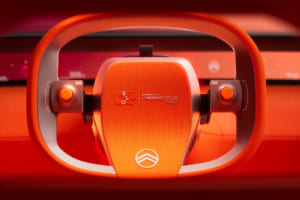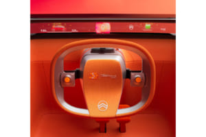 ELOのインテリアは、従来の自動車の概念を根底から覆すレイアウトが採用されている。最も象徴的なのが、運転席を車体中央の最前列に配置した独自のドライビングポジションだ。これによりドライバーは左右180度に広がるパノラマ視界を確保できるだけでなく、両側のスペースが解放されることで車内での移動がスムーズになっている。ステアリングには、1955年に登場した名車「DS」へのオマージュとしてシングルスポークのデザインが3Dプリント技術で再解釈されて採用された。