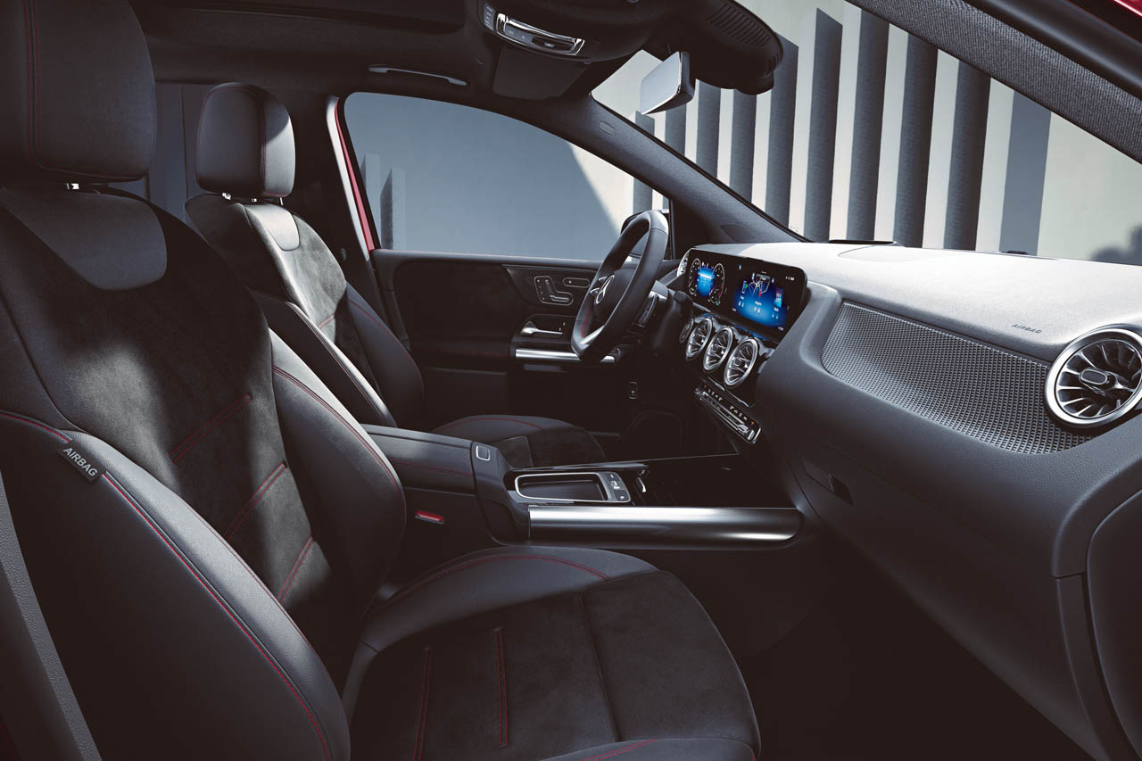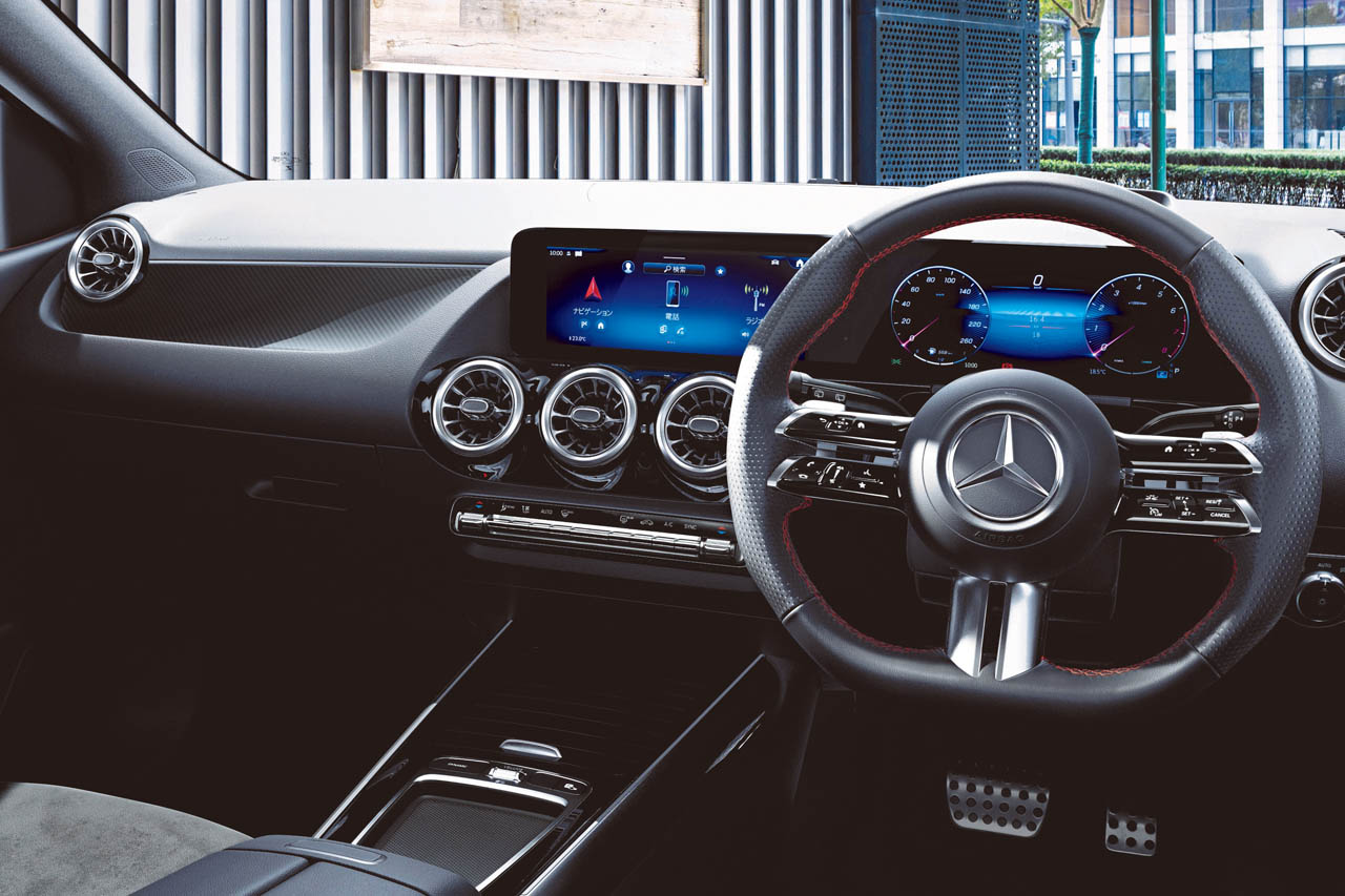 ドライバーが手に触れるステアリングホイールには、「本革巻スポーツステアリング(ナッパレザー)」が標準装備され、インテリアトリムにはカーボンルックが採用されるなど、細部にわたりデザインに磨きがかけられている。インフォテインメントシステムには対話型の「MBUX(メルセデス・ベンツ ユーザーエクスペリエンス)」を搭載しており、「ハイ、メルセデス」をキーワードに起動する音声認識機能によって、目的地入力や電話通話、音楽選択に加え、クライメートコントロールや照明などの操作も可能である。