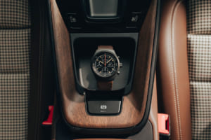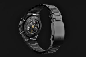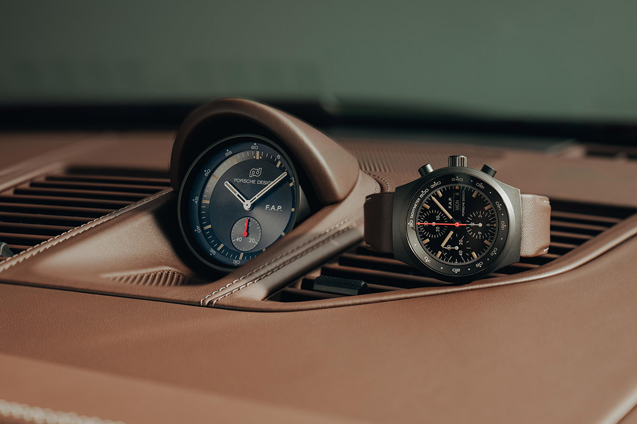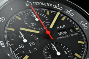 時計、F.A.ポルシェのイニシャルが3時の位置に表示される特別仕様で、自動巻きムーブメントのローターはコレクターズカーのホイールと同じ形状と色を採用。ケースは1972年のオリジナルと同様にブラックコーティングされたチタン製で、裏蓋には限定番号とF.A.ポルシェの署名が刻印される。
