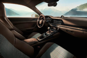 また、ツーリングパッケージモデルには通常設定のない「スポーツクラシックホイール」がサテンブラック仕上げで組み合わされている。このホイールはクラシックなフックスにインスパイアされたもので、エンジンフードのグリルには「90 F.A.Porsche」のロゴ入り金メッキ・エンブレムが取り付けられている。