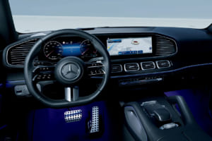 標準ホイールは、20インチから23インチAMGアルミホイールへと大径化し、重厚感を強調。さらに、AMGラインエクステリアと、フロントグリルがダーククロームに変更されるナイトパッケージを標準化し、エクステリアにおける存在感を強調している。このほか、イルミネーテッドステップカバー(ブラック)とノイズ軽減タイヤも装備。