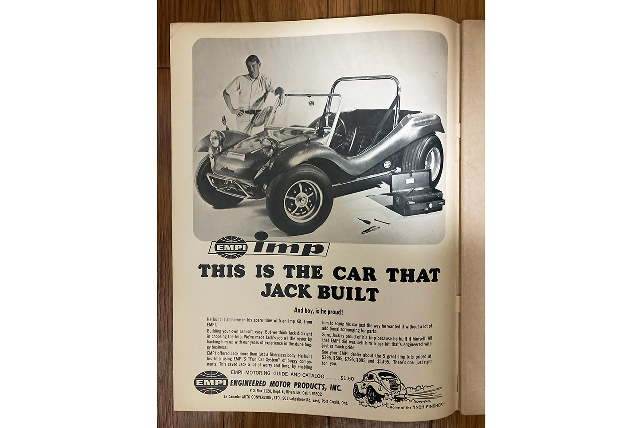 前回も触れたが、1969年頃にヤナセはEMPI Impを試験的に輸入しており、この時期、国内自動車誌で何度か取り上げられている。そのひとつが表紙に同車をフィーチャーした「CARトップ」誌1969年3月号。ヤナセ協力のもと、大久保 力さんが砂浜でインプレッションを行ったモノクロ3ページの記事に、当時アメリカで発売されていたFRP製ボディの様々なバギーを集めた2ページを加えて特集を組んでおり、デューンバギー市場が瞬く間に爛熟した当時の様子が伝わってくる。