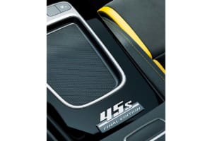 室内には、本モデル限定装備の「レザーARTICO/MICROCUT ブラック(イエローステッチ)」、 「AMGパフォーマンスステアリング(ナッパレザー/MICROCUT)」、「Final Edition専用 AMGアルミニウムインテリアトリム」、「Final Edition専用バッジ(センターコンソール)」 「Final Edition専用フロアマット」、「イエローイルミネーテッドステップカバー」を採用。