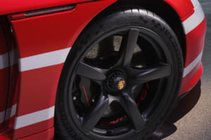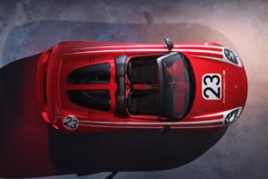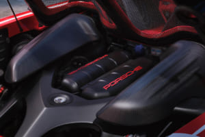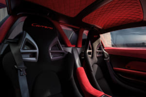 外装の細部では、ルーフ、A/Bピラー、ドアミラーキャップ、フロントのエアダクト、リアディフューザーなどにマットブラックのカーボンが採用され、赤と白の塗装と鮮やかな対比を見せている。エンジンカバーのグリルはマットブラックのアルマイト処理が施され、オリジナルの5スポーク・デザインを維持したブラック塗装のホイールには、カラーのポルシェクレストがあしらわれた。