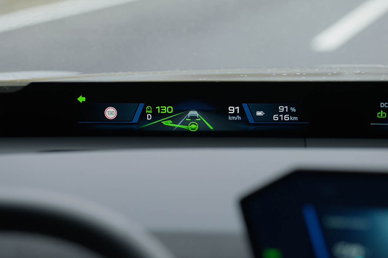 このディスプレイの最大の特徴は、オフの状態では真っ黒で存在を感じさせないが、オンにするとフロントガラスの全幅にわたって情報が浮かび上がる点だ。マケシン氏によれば、ドライバーはディスプレイそのものを見るのではなく、1.2m前方に投映された像を見ることになるという。これにより、ドライバーは道路上の状況にフォーカスしたまま、視線を下げることなく必要な情報を確認できる。従来のメータークラスターを覗き込む動作が不要になるため、視線移動が最小限に抑えられ、安全性が飛躍的に向上する設計だ。