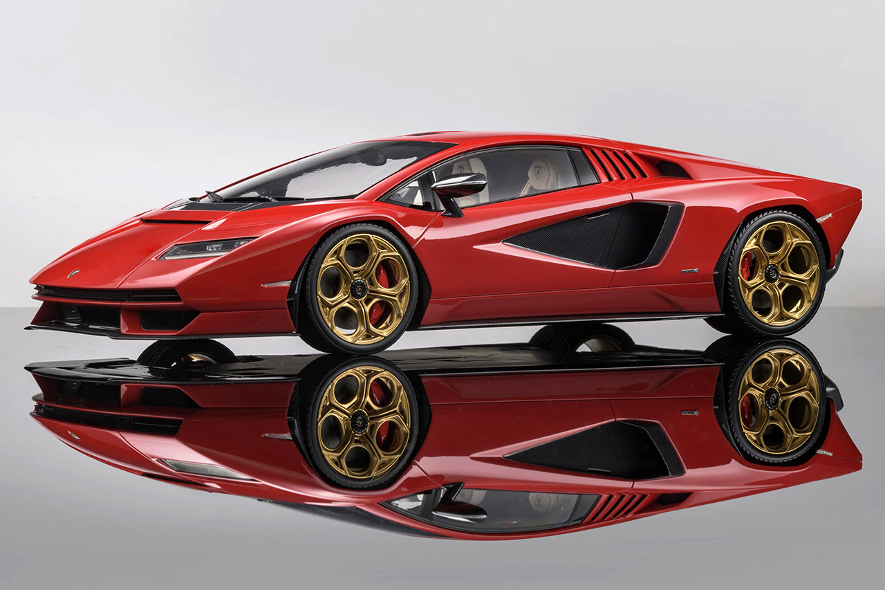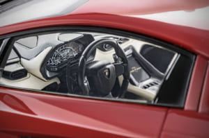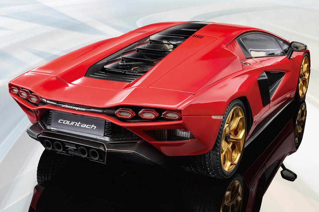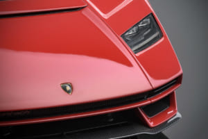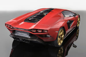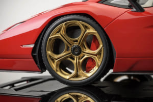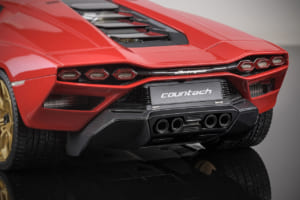 上述した以外でも、明らかに初代カウンタックをオマージュした形状のテールライト・ハウジングの彫り込みの深さや、実車のパーツ構成を検証して、それに倣った構成を採った灯火類も実車そのものの表情を見せている。
