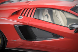 肝心のデザインだが、50年前にベルトーネ時代のマルチェロ・ガンディーニが成し遂げた革新的偉業をオマージュする責務を請け負ったのは、ミィティア・ボルケルト。上に跳ね上がるシザードア、スリットが刻まれたフロントグリル、ルーフのペリスコープ(バックミラー)、ボディサイドの巨大なNACAダクト風インテークなど、エクステリアの随所にカウンタックを名乗るに相応しい、象徴的なディテールが巧みに組み込まれている。