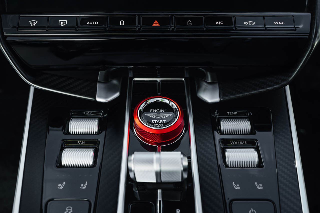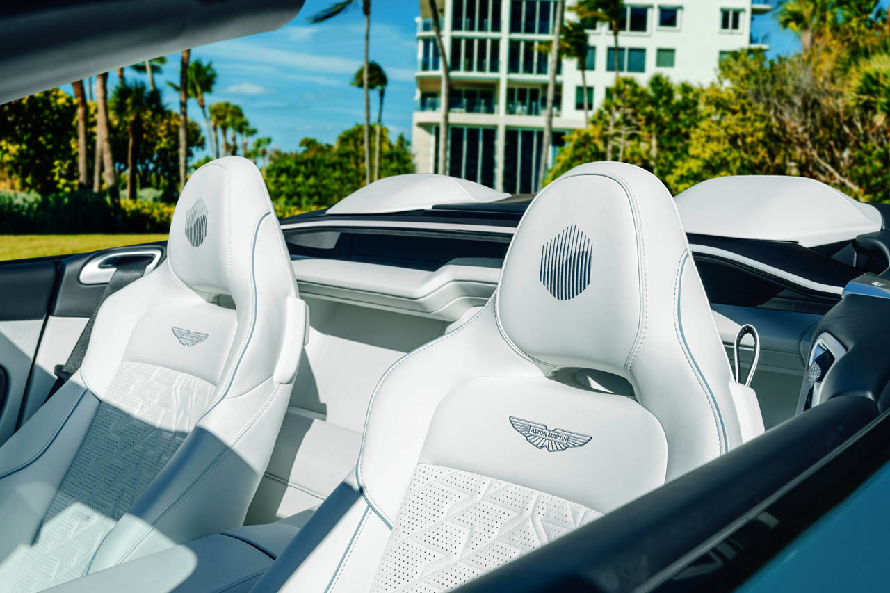 ショルダーストラップにはアストン・マーティンのウィングロゴがステッチされ、エレガントな雰囲気を高めている。また、キャビン後方のカーボンファイバー製クロスブレースには、エクステリアと同様にクラブスポーツ・ホワイトのピンストライプが施されており、外装と内装のデザイン的な連続性が保たれている。インテリアにおけるアクセントとして、レッド・アルマイト仕上げのスタート/ストップ・ロータリースイッチが装備されているが、これもエクステリアのブレーキキャリパー同様、沿岸のブイを示唆する繊細な演出である。