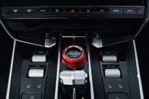 エネルギッシュなエクステリアとは対照的に、インテリアは視覚的なテンポを反転させ、静寂とバランスを呼び覚ます穏やかで光に満ちた空間が広がっている。キャビンは「グレイシャー・ホワイト」を主要色とし、グロスブラックのカーボンファイバーによるディテールが組み合わされている。ここでは、ペールブルーのコントラストステッチとウェルトが採用されており、これらは流れるような波の頂点を抽象的に解釈した特注の「ウェーブ・モチーフ」として、ヘッドレストへの刺繍やシルプレートへの刻印に用いられている。