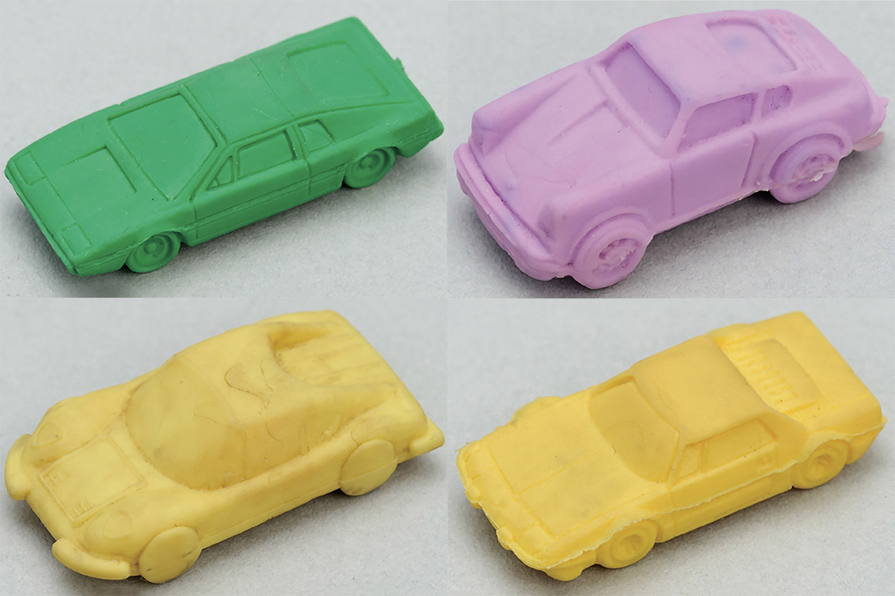 スーパーカー消しゴムとはその名の通り、スーパーカーとされる様々な車種を模したゴム製品(消しゴムとは言うものの、文字を消す能力はナシ)。大きさは長さ3cm程度のものが主流で、形状の再現ぶりは稚拙なものからなかなか巧みなものまで玉石混淆でしたが、当時の少年たちはそれらを手に、まだ見ぬスーパーカーたちの雄姿に想いを馳せたものでした。駄菓子屋やガチャガチャ(今でいうカプセル玩具)での販売が主流であり、その買いやすさも魅力のひとつだったと言えましょう。