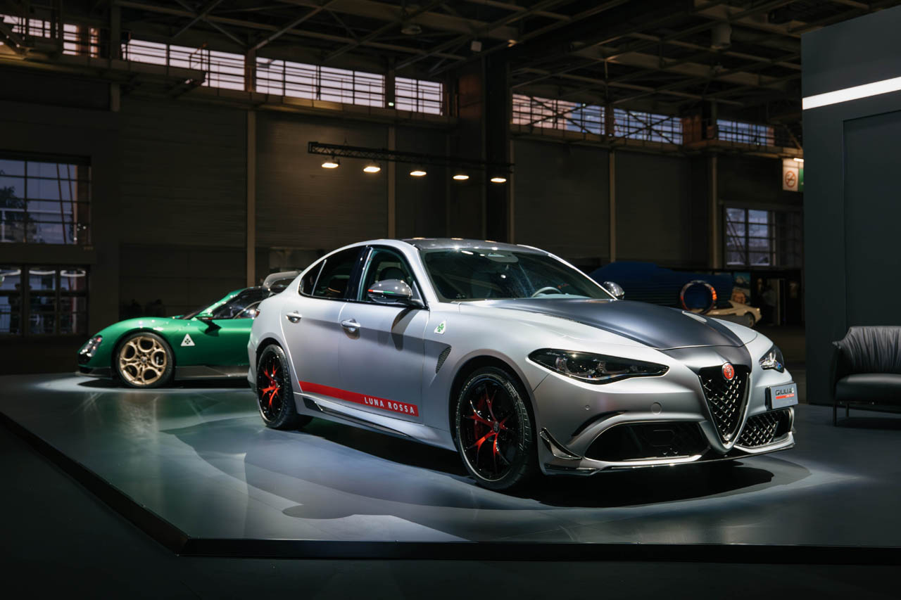もう一台は、わずか10台限定で生産された「ジュリア・クアドリフォリオ・ルナ・ロッサ」だ。これは第38回アメリカズカップに挑戦するルナ・ロッサとのパートナーシップを記念したモデルであり、ボッテガ・フォーリセリエの哲学を体現する高度な技術の結晶である。特筆すべきはエアロダイナミクスで、専用のカーボンファイバー製キットにより、ダウンフォースは標準モデルの最大5倍に達する。インテリアには実際の帆から調達した素材が使用され、海上のレースの世界との深いシナジーを感じさせる仕上がりとなっている。