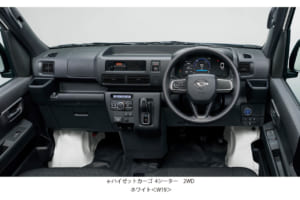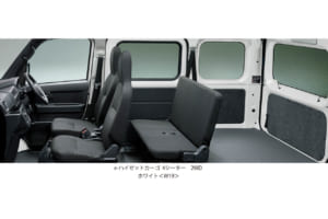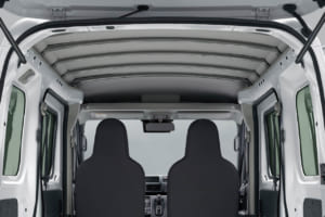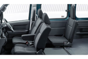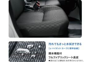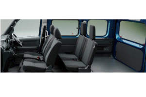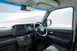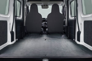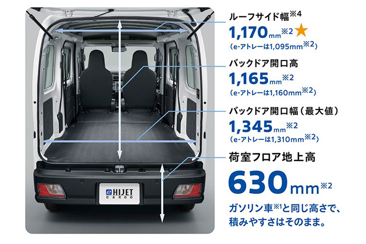 バッテリーを床下のデッドスペースに配置することで、ベース車と同等の積載性を維持している。「e-ハイゼットカーゴ(4シーター)」の荷室サイズは、荷室長1920mm(2名乗車時)、荷室幅1410mm(4名乗車時)、荷室高1250mmを確保。これは軽キャブオーバーバンとしてトップクラスの数値であり、最大積載量もガソリン車同様の350kg(2名乗車時)を死守している。