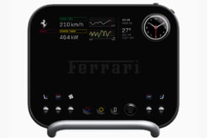 ドライビングの始まりを告げる「キー」にも、フェラーリらしいドラマチックな演出が施されている。自動車用ガラスとして初めて採用された高耐久なコーニング製フュージョン5ガラスと、電力消費を抑える「Eインク」ディスプレイを組み合わせたキーは、センターコンソールのドックに挿入されると色が変化し、システムが「静」から「動」へと切り替わる。