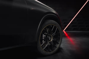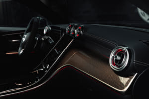 足元には、テックゴールドのリムフランジを持つマットブラックの21インチAMG鍛造ホイールが装着され、その奥には白いAMGロゴ入りのブラック・ブレーキキャリパーが存在感を放つ。インテリアにおいても、ブラックレザーのAMGスポーツシートにゴールドのステッチが施され、カーボンファイバー製のトリムには金属糸が織り込まれるなど、ハイパフォーマンスモデルに相応しい上質でスポーティな空間が演出されている。