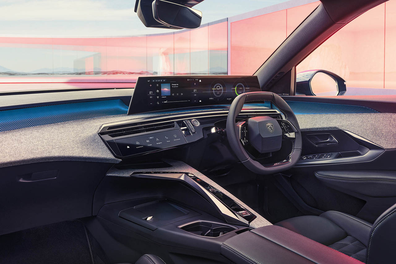 インテリアには、21インチのパノラミックカーブドディスプレイと小径ステアリングを組み合わせた「PEUGEOT Panoramic i-Cockpit」が採用された。視認性と操作性を高めるとともに、最大10個の機能をカスタマイズできる「i-Toggles」により直感的な操作を実現している。ラゲッジスペースはファストバックの流麗なスタイリングでありながら、通常時で520L、リアシートを倒せば最大1480Lという容量を確保し、実用性も犠牲にしていない。