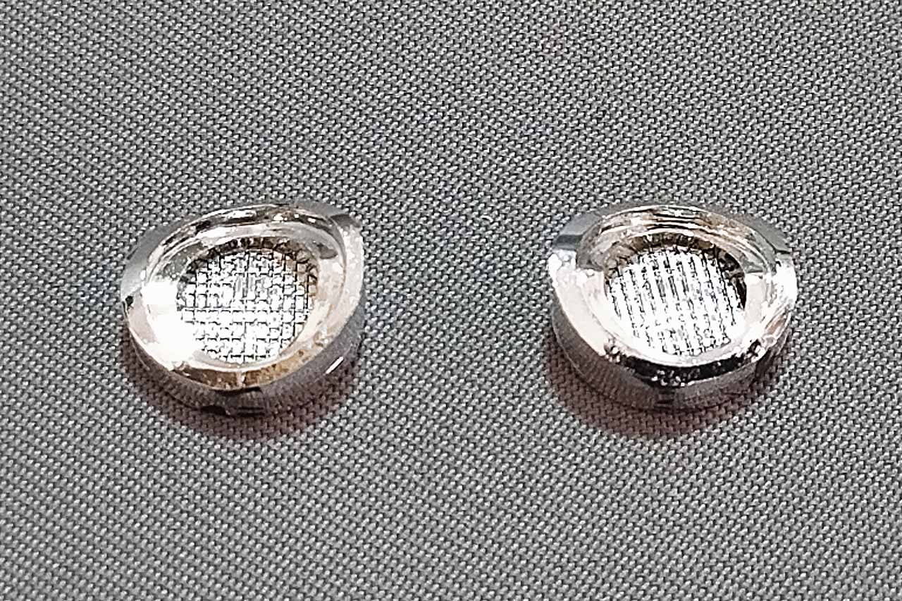 キットのヘッドライト部品。リムとライトレンズが一体のメッキ部品だ。リムの内側に外側の透明カバーを乗せる段があり、リムが太く内側が狭いため、ライトレンズ部分が小さい。このキットの印象として「ヘッドライトが小さい」という声をよく聞くが、その原因のひとつがこれだろう。