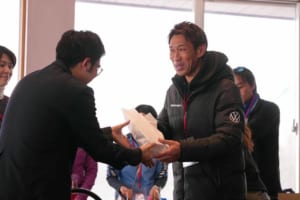 元オリンピック代表で、スキーの全日本技術選で3度の優勝を誇る、プロスキーヤーの吉岡大輔氏によるスペシャルレッスンも実施。吉岡氏が参加者の滑りを確認し、スキー技術を向上するためのヒントを伝授するワンポイントアドバイスを行った。