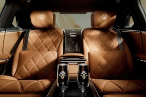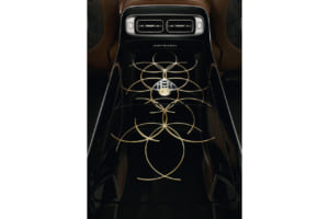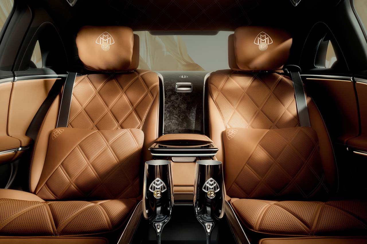 後席リアコンソールにもマイバッハ・エンブレムの下にゴールドのインレイをあしらい、「12」を組み合わせたマイバッハ・エンブレムが12個のゴールドサークルに囲まれるように配されるなど、細部に至るまで比類なきクラフトマンシップが演出されている。