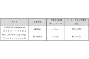 総電力量44.9kWhのバッテリーを搭載し、一充電走行距離415kmを誇る「Baseline」のメーカー希望小売価格は299万2000円(税込)に設定されている。また、総電力量58.56kWhのバッテリーを搭載し、一充電走行距離476kmを実現する「Long Range」は374万円(税込)となっている。
