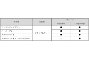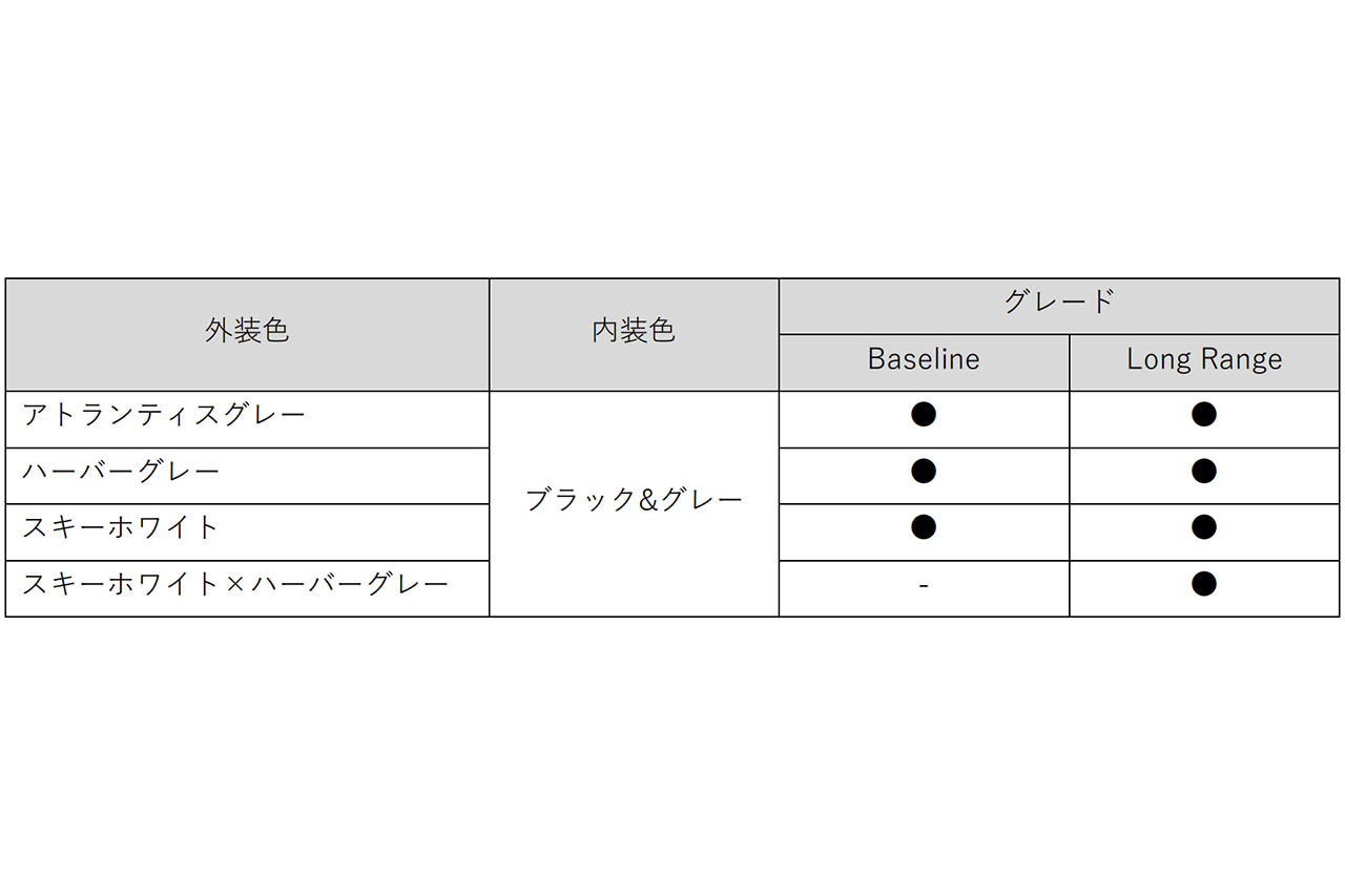 これにより、モノトーンカラーはアトランティスグレー、ハーバーグレー、そしてスキーホワイトの3色展開となる。さらに「Long Range」専用のカラーコーディネートとして、スキーホワイトとハーバーグレーを組み合わせたツートーンカラーも用意された。なお、内装色は全ボディカラー共通でブラックおよびグレーの組み合わせとなる。