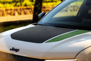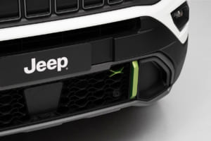 また、専用のシグネチャーデザインとして、フロントバンパーの“X”アクセントやリアに配した”4xe”エンブレムに加え、ホイールをブラック仕上げとすることで、力強さと精悍さを強調。フロントバンパー下部には渡河性能400mmを示すジープダックのマーキングを施しており、ここにも遊び心が見られる。